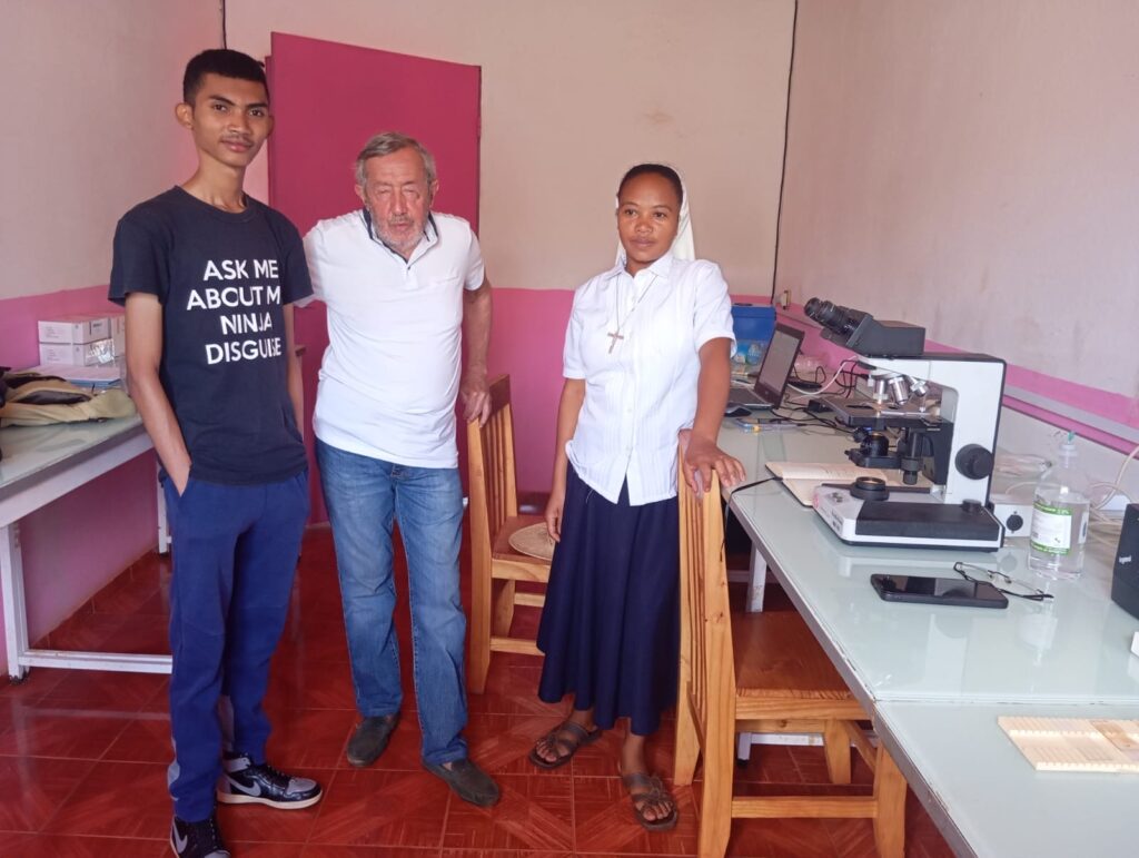 Au mois de novembre 2024 dans le cadre de BSF, le Dr Jean Louis Didier est retourné à Madagascar pour l’installation de paillasse récupérées à Grenoble dans un laboratoire d’histologie qui allait déménagé. Cette installation a eu lieu dans le Centre De Santé Tsinjosoa qui souhaitait la création d’un petit laboratoire. Le centre est situé à Bemahatazana petite ville de brousse à cinq heures environ de piste de Tsroanomandidy la ville la plus proche et à 260 km à l’ouest de la capitale Antananarivo (10 heures de route et de piste). Cette création fait suite à la demande de la Fondation Mérieux et de la congrégation des Soeurs de Notre Dame de la Salette.